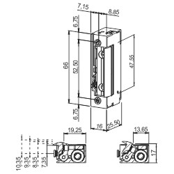 greenteK električni otvarač vrata sa poluprečnikom rezom, podesivim brave i mehaničkim otključavanjem. GreenteK električni otvarač vrata BK-A sa funkcijom radijalne brave radi u opsegu napona od 10 - 24V AC (naizmenična struja), 43 oma. Priključci se mogu stegnuti i kompatibilni su sa svim ureznim bravama. Pogodan za prihvatne ploče koje su pripremljene za E-otvarače sa montažnim rastojanjem od 52,5 mm, bez klizača. GreenteK električni otvarač vrata BK-A sa podesivim delom reze i mehaničkim otključavanjem može se koristiti sa leve i desne strane zbog svog simetričnog dizajna. Prednosti poluprečnika reze: mali radijus otvaranja. Tehničke specifikacije: Materijal: Zamak liveni cink Dimenzije (VkŠkD): 66 k 16 k 25,5 mm Sila držanja: 3,750 N / 382 kg-f Radna temperatura: -15°C do +40°C Potrošnja energije stabilizovana DC: 11 - 13 V DC AC maksimalno pristrasnost: 270 (12V AC) / 340 (24V AC) DC maksimalno pristrasnost: 40 (12V DC) / 200 (24V DC)